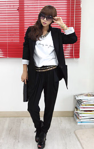 韩式外套搭配:黑色薄款西装棉外套的百搭实用不必多说,无论搭裙,搭裤几乎什么风格都能胜任,西服的款式也非常修身有型。