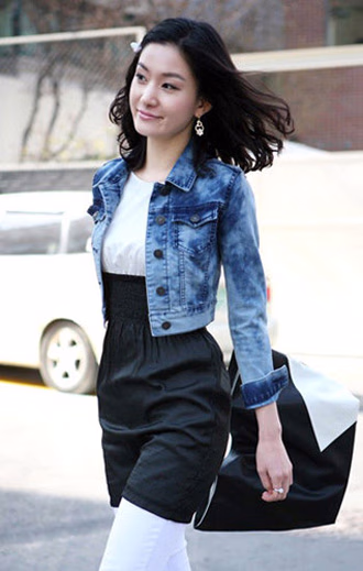 韩式外套搭配:基本款牛仔外套更年轻更活泼可爱一些,也同样百搭实用,而且不存在过时的问题。迷你款短牛仔夹克最能突出时髦感,内搭配连衣裙再配上紧身裤,韩范儿十足非常抢眼。