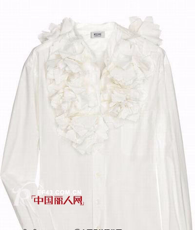 白色的普通衬衫中搭配了大花边的领口设计让女性穿上后变得柔美,不再呆板。