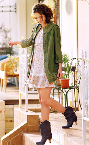 不要认为碎花裙就是只能穿出小女人的可爱,搭配上军绿色的外套和一双流行的中筒靴,参杂了一些中性的气质之后更有风格了。