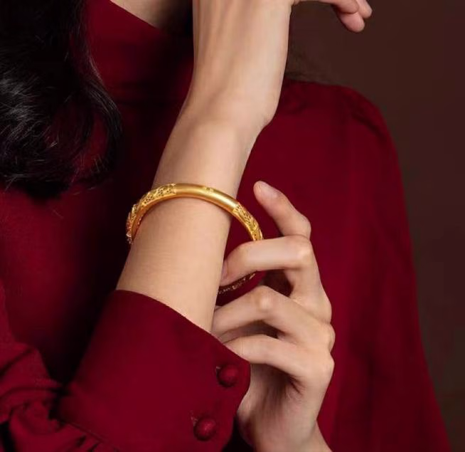当下最流行的就是古法黄金手镯,现在很多珠宝品牌都有推出古法黄金手镯,哑光和磨砂的质感戴在手上很有味道所以适合把玩佩戴。古法黄金手镯以实心的居多,价格还是比较高的,年轻女孩佩戴过于奢侈,过了30岁的年纪成熟稳重,古法黄金手镯是复古的款式,看起来低调奢华,所以40岁的年纪佩戴黄金手镯是很合适的。