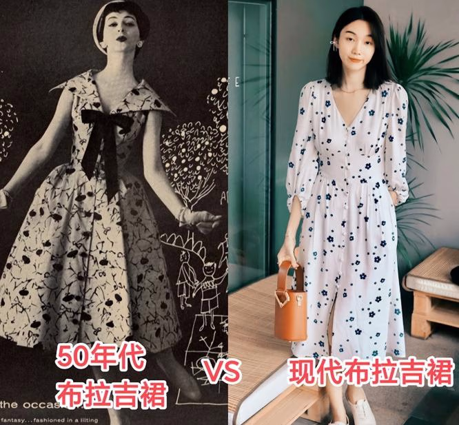 在时尚的轮回中,有两个单品最受人瞩目:布拉吉裙和喇叭裤。布拉吉裙其实就是当下最流行的各种碎花裙或小图案连衣裙,对比50年代流行的布拉吉裙和现代布拉吉裙,完全看不出多少差别。