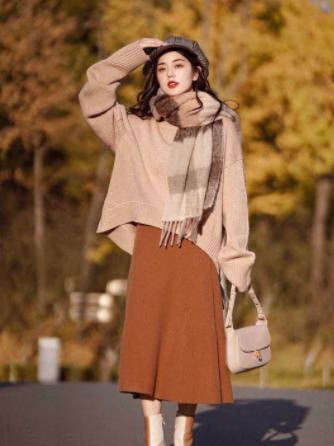 这一身是非常经典的秋冬打扮,全身采取深浅不一的棕色系色调,显得整个人温柔美丽。宽松的驼色毛衣,加上修身的红棕色长裙,显得整个人修长瘦小。再搭配上可爱的贝雷帽和格子围巾,这不妥妥的元气少女嘛!