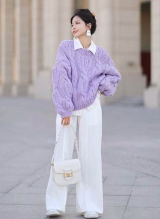 紫色神秘而浪漫,在沉闷的冬天穿上紫色很两眼。宽松的设计能够很好的包容住我们的身材,里面搭配一件修身的衬衫,既可以增加层次撞色感,还能降低毛衣的厚重感。宽松的白色阔腿裤,让整个人看起来清爽又简约。