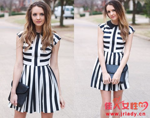 连衣裙结合横条纹与竖条纹在视觉带来更多趣味,黑白竖条纹的百褶裙身先是灵动的流苏状态,展现更飘逸的效果,搭配一个黑色信封包和白色尖头高跟鞋,造型色调上相互照应。