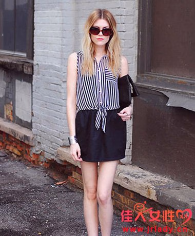无袖竖条纹衬衫,休闲中带点中性范,宽松版型的半身黑裙更显休闲,同时利用黑色短皮靴给自己的帅气度加分。