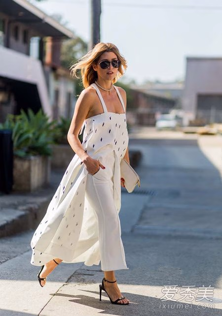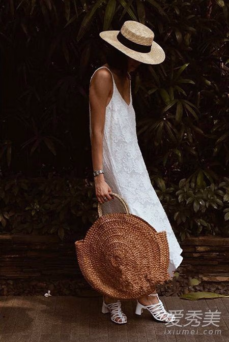 长款背心裙+编织帽,也是超级适合度假的一款造型,白色花朵刺绣让背心裙精致到每一个细节,拼接蕾丝设计更是华丽吸睛,搭白色绑带凉鞋好养眼。