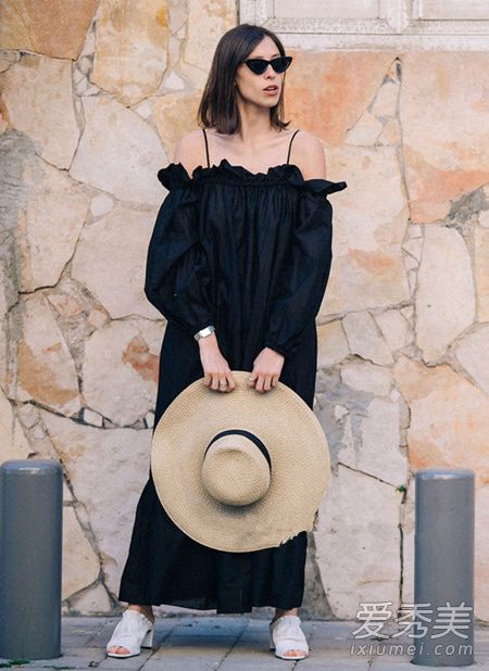 一字肩吊带款式的长裙,一字肩遮肉显瘦,加上细肩带更是增加性感指数更实用,胸前是花边领和褶皱设计,起到一个模糊焦点的作用,就是胸小的妹子创业不怕,选择长度到脚踝的款式不仅能防晒还更休闲,戴上遮阳帽就可以美美出去玩了。