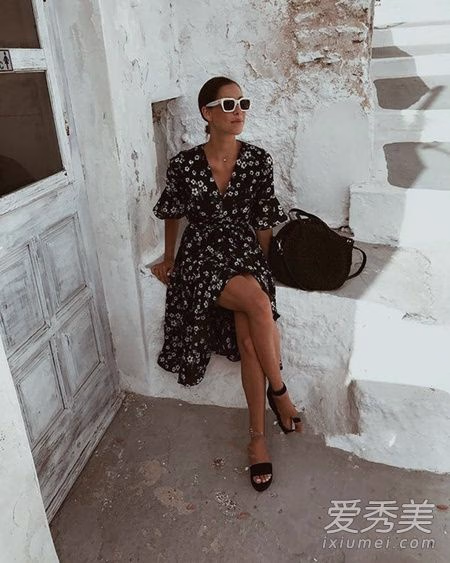小碎花图案的裹身裙,侧面系带成为亮点,黑白印花加上荷叶边袖口遮肉显瘦,裙摆只有散开露出大腿更性感。