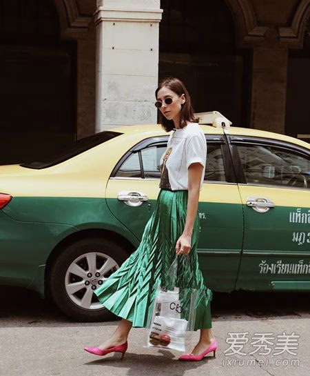 短袖+中长裙,中长裙夏天依旧也很火,百褶款式的中长裙尽显曲线美,裙摆上增加点纹路设计更新潮,棉t+高跟鞋就可以美美出街,搭配今年最火的透明塑料包袋更是赞呢。