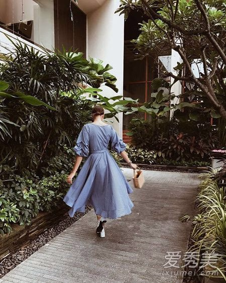 复古连衣裙,蓬蓬袖加上收腰设计遮肉显瘦的效果超级好,外廓的大裙摆更是优雅吸睛,浅蓝色配上薄纱面料看着就好清爽呢,搭配粗跟凉鞋美美度假去!