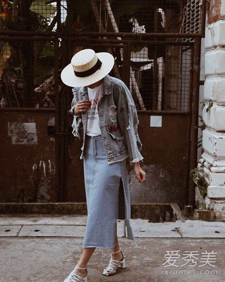 牛仔外套+牛仔半身裙,要体现度假风穿搭,牛仔外套绝对是少不了的,复古水洗蓝文艺养眼,高开叉的牛仔长裙和破洞款式的牛仔外套搭配,有点个性又帅帅的。