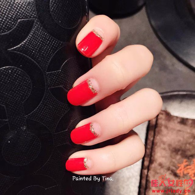 红色美甲用金色亮片镶个月牙边也很漂亮的哦。