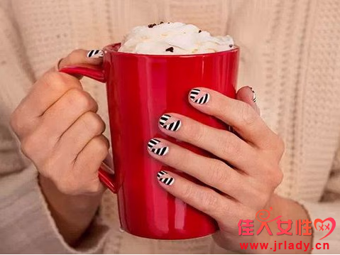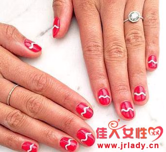 又是一款红白搭配,不过这一款的感觉完全不同。白色的指甲油在红色甲油中间的位置画上波浪形状,个性前卫,还带一点点俏皮的感觉,让指尖瞬间摆脱沉闷感。