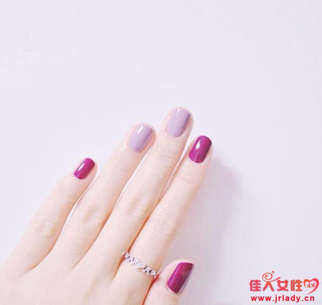 冬天美甲适合什么颜色拼色美甲也是不错的选择,将两种不同的红色甲油搭配在一起,一深一浅超级美的。先用浅红色的指甲油打底,等干了之后,指甲上贴上一条胶带,要按照半圆形状贴哦,然后再指甲上半部分涂抹暗红色甲油,干了之后撕掉胶带就可以了。