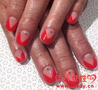 半透明美甲是今年流行的元素,不要整个指甲都涂抹上红色,只要在指尖像上图这样,画出法式的形状,然后再底部黏上圆形的铆钉就可以了,简单又fashion。