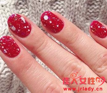红色跟白色的搭配其实很好看,这款指甲用红色指甲油来打底,然后选择大小不一的白色的亮片指甲油涂抹上去,搭配在一起时尚好看,比用白色甲油画上去更加潮。