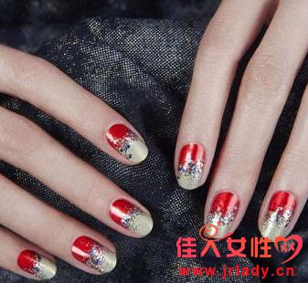没想到吧,红色居然还可以跟香槟色搭配。底色同样选择红色甲油,然后再指甲尖涂抹香槟色甲油,随后在两种颜色交界的位置,涂抹上银色两片甲油就可以了。