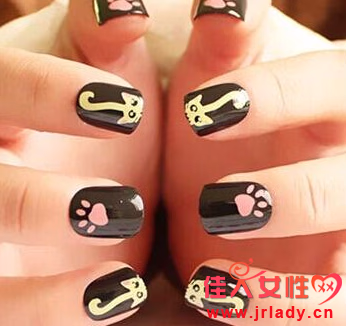 用酷酷的黑色作为底色,可爱的长尾猫和萌萌的小肉垫相间描绘在指甲上,两种不同风格的冲击逐渐演变成一种独特的可爱风格。