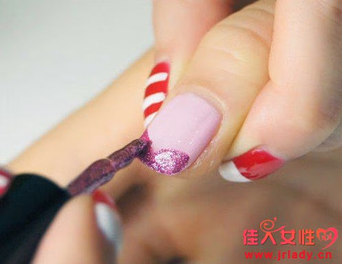 STEP2:选用带有亮片的深紫色画在指甲的上端,就像画一个爱心的上半段一样,在指甲上做出一个最简单的花瓣,如图。