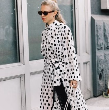 长款波点裙,复古风的波点配上厚底的老爹鞋也是超人最爱,对身高不是很自信的妹子也可以试试这种穿法,厚底鞋+短袜时髦洋气,黑白配色和波点长裙搭配活泼俏皮。