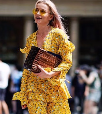 女人味十足的荷叶边裙,荷叶边+黄色碎花超级养眼,亮眼的黄色在春夏绝对是最亮眼的一笔!搭白色绑带球鞋更是轻松休闲,腿短的妹子也可以驾驭呢,姜黄色碎花更是让人感觉元气满满。