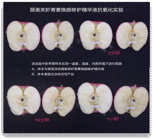 涂过薇美芙虾青素精华的A苹果,几乎没有氧化现象,苹果表面依然白净。