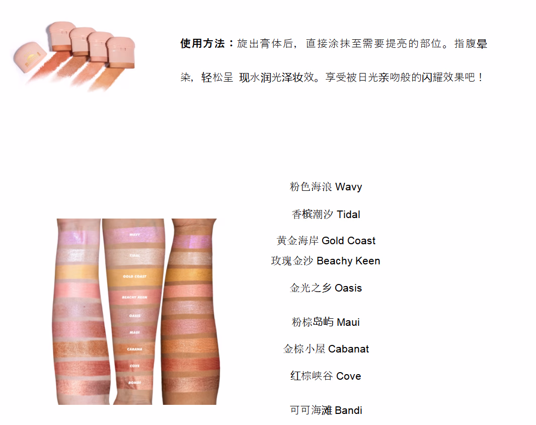 Lime Crime独角兽日光之吻肌光棒,好似一款多用途的高光棒,给脸部和身体肌肤带来细闪透亮妆效。共有九种色号可供选择 – 粉色海浪Wavy、香槟潮汐Tidal、玫瑰金沙Beachy Keen、金光之乡Oasis、粉棕岛屿Maui、黄金海岸Gold Coast、金棕小屋Cabanat、红棕峡谷Cove及可可海滩Bandi。随心定义皮肤光泽,打造从亮白到古铜色的透亮微珠光效果,瞬间拥有层次分明光感妆效。内富含花梨提取物、荷荷巴油及葵花籽油等天然成分,润泽肌肤的同时帮助皮肤保持水分,让妆效自然更持久。触感丝柔顺滑的外包装,独特的扁平旋钮设计,使妆容细节易抹易控,轻巧便携随时补妆。