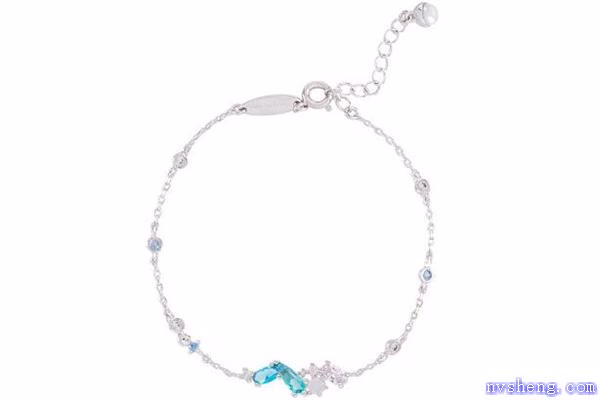 noonoofingers这款手链蓝绿钻相结合,手链上还有有几颗小钻珠,蓝色水钻搭配白色,超美,让人忍不住想要拥有。手链扣子也是活动的,手链背面的椭圆牌子上有自己品牌的logo,戴出去不容易跟别人撞款,令人心动。手链比较纤细,戴起来让人感觉手也纤细。