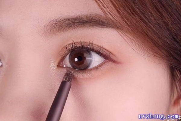 上眼睑眼线要细细地画满睫毛根部的褶皱,眼头和眼梢要自然。下眼睑的眼线要从眼梢的偏下方开始,一直画到黑眼仁处为止。注意力道要轻柔,薄薄地画上一层即可。通过制造阴影效果来降低眼梢高度。 用浅色眼影晕染整个眼窝。深色眼影涂在眼线上方,黑眼仁部分要轻轻地多涂几层。 在下眼睑的眼线上涂上深色眼影,注意晕染范围要广,用指尖轻轻晕开眼影,使其与肌肤相融合。这样做可以让脸颊看上去不那么长。 睫毛要自然弯曲向上,下睫毛也要充分刷开。