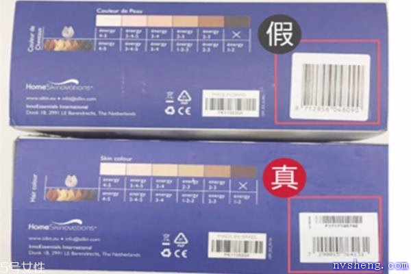 3、看包装盒条码小仙女们在辨别Silk'nInfinity脱毛仪真假的时候,要记得看包装盒条码。产品外包装盒分别印有2个条码,上方为产品序列号(即验真码),下方为产品自身编码。同时盒面文字说明均使用以色列希伯来语印刷。而假货仅有一个产品编码,没有产品的序列号,同时外包装印刷为英文字样。