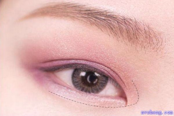 用珊瑚橘眼影笔打底,涂抹在图中标示的眼窝内,用无名指晕开,眼尾睫毛根部颜色深,越往眼皮上方走,颜色要越浅,这样会有渐变的感觉。