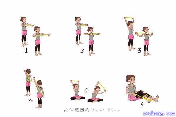 这个动作和坐姿划船很像,只是不需要大型器材。一条弹力带就可以达到效果。 身体成坐姿,上半身挺直,脚伸直。将弹力带绕过脚底,用手掌握住两端,把弹力带往身体的方向拉,直到手掌在腰侧的位置为止,过程中背部都要打直,不可以驼背。如此重复30-40次。