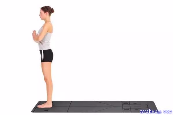 站定后双手合十,大拇指与手指呈90度角,压在胸骨。双眼闭上,将注意力放在胸口。