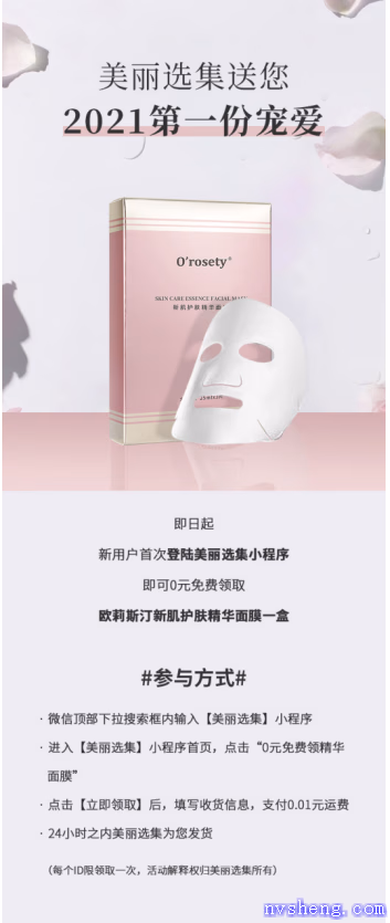 除此之外,美丽选集为了造福广大爱美用户,贴心为大家带来0元免费领取O'rosety欧莉斯汀新肌护肤精华面膜的福利活动。O'rosety欧莉斯汀作为美丽选集旗下自主品牌,经过2年精心研发,和多轮预约内测,其新肌护肤精华面膜收获用户好评如潮。而本次上新的O'rosety欧莉斯汀新肌护肤精华面膜在成分功效上更是进行了全面升级,主打三大神仙成分:清酒酵母菌、水光钛、乙酰葡糖胺,满足补水、美白、修复等多种肌肤需求。