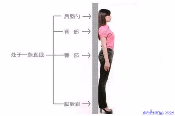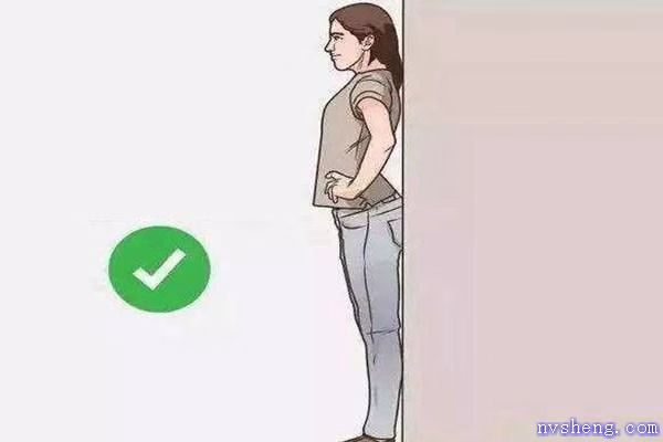 5、站姿要正确:把头部、肩胛骨、臀部、脚后跟这4部分紧贴墙壁笔直站好。注意收紧自己的腹部和臀部。同时全身肌肉要紧绷,挺胸收腹,肩外展,腿部稍用力。
