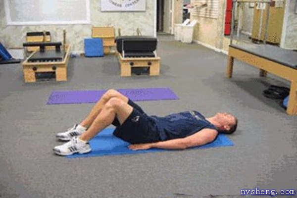 1、身体平躺在垫上,双手掌心向下平放于身体两侧,双腿微微分开至略宽于肩并弯曲呈60度角,两脚掌平踏于垫面。
