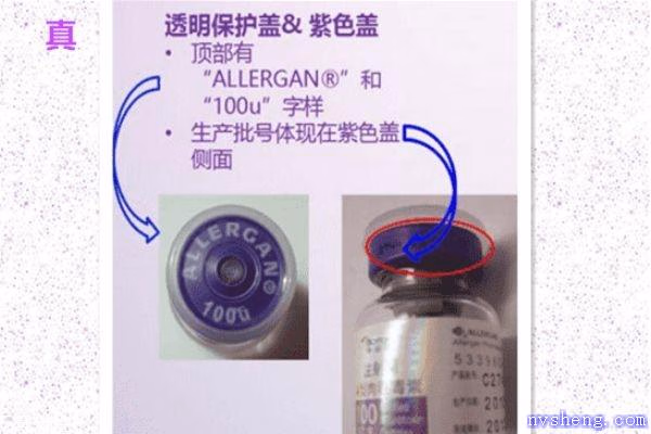 瘦脸针美国保妥适真假之瓶盖对比正品的美国保妥适瘦脸针,原始包装并不是针剂样的,而是瓶装。美国保妥适肉毒素瓶子是由透明保护盖和紫色盖组成的,顶部有“ALLERGAN”和“100u”字样。生产批号则体现在紫色盖子的侧面。