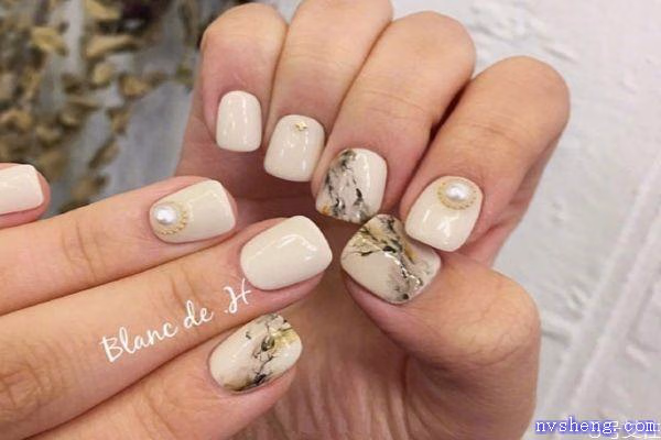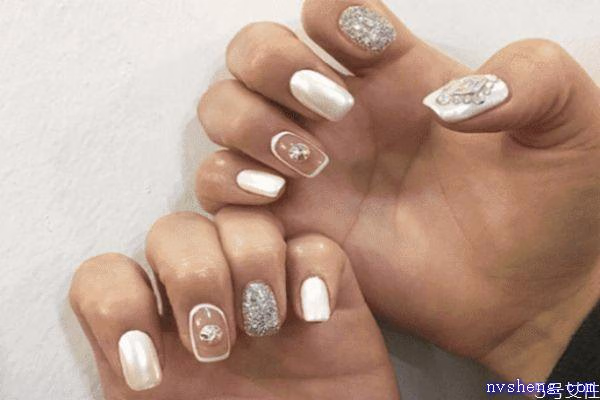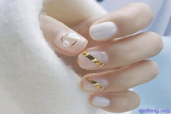 第五款的话很女神了哟~采用的整体是珠光白甲油,配合了金箔纸和金属圈、珍珠等做装饰,超级仙了耶~