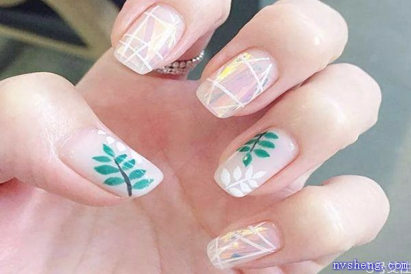 第三款也是非常清新的一款,采用了白色甲油上面勾画了叶子,同时还配合了镭射美甲,既清新但是又很有特色的一款。