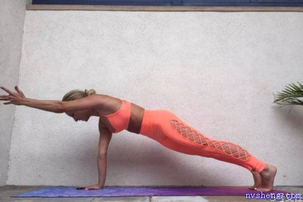 1、右手往头顶方向高举伸直,左手弯曲,抓住右手的手肘处。