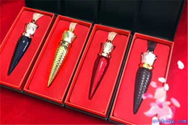 CL口红管造型参照了红底鞋鞋跟的设计,继续呈尖锥形,极富视觉冲击力的外壳造型,让人看一眼就深深被其迷住。此外富有性感挑逗意味的红黑搭配,也同样被使用在口红系列中。每支唇膏管的尾部还加入了用于穿入丝带的铝圈,使其也可像首饰一样佩戴在脖子上。