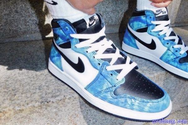 此鞋款延续了经典的 Air Jordan 1高帮造型,鞋身采用黑白配色的皮革材质,鞋身侧面为白色,采用常规的皮革。鞋舌及SwooshLogo部分为黑色,均采用荔枝皮革,质感更加细腻,尽显高规格配置。鞋头部分也换上了黑色系装扮,易于打理,还可隐藏长时间穿着的褶皱纹理,相当细心。鞋帮飞翼部分同样以黑色调相呼应。鞋身上最吸引人注意的,自然就是蓝色的扎染工艺装饰了,看起来就像浸泡在波光粼粼的游泳池中一般,十分动感耀眼且清爽,格外抢眼。这一工艺以往从未在Air Jordan1鞋面上使用过。而且从目前曝光的多双实物图来看,该鞋款可以说深得扎染精髓,每双鞋的扎染效果都独一无二,称得上是真正意义上的“不撞鞋”。整体来看,此款鞋轮廓硬挺,搭配醒目的扎染工艺,颇有新意,上脚辨识度超高,相信会成为不少鞋迷朋友们的心头好。