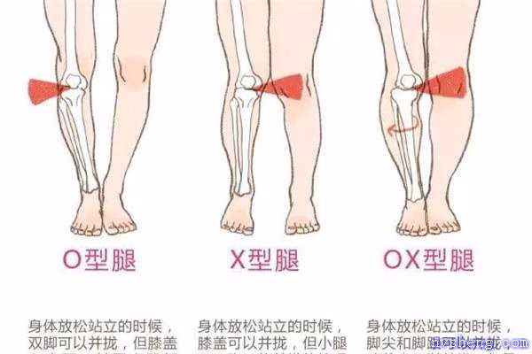 正常直立时双脚可以并拢,而膝盖不能并拢,双膝向外张,为O型腿。