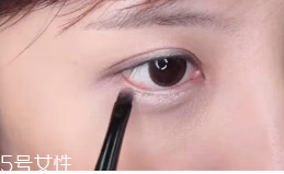Step5:用咖啡色眼影涂在下眼线的前面和后面,使下眼线显得比较纤长,记得要将咖啡色眼影和中间的香槟色眼影自然的晕染好哦!