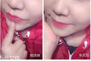 我用中等力度涂抹,完全遮盖暗沉纯色。刚涂抹后有光泽感,唇部不会感觉滞重,很舒服,颜色亮艳,明丽得很。半天后再看,这个过程基本不会特意保护口红,喝水吃东西,抿嘴等等都做,再看时,会发现口红的颜色色调变得融入唇部的颜色,不会像刚涂抹时那么艳丽,但是变得贴合自然,持久度令我绝对的满意,遮盖力很稳定。