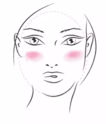 圆脸:圆圆的娃娃脸最需要拉长脸颊,这样才能显脸瘦,因此打腮红的方式也要变成斜向上的形状,从跟鼻翼水平的位置以45°角向眼尾处延伸。