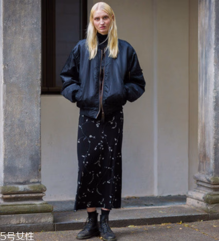 其实马丁靴也是可以搭配裙子的,再加上飞行员夹克,这种甜美风也能搭配的很好看。