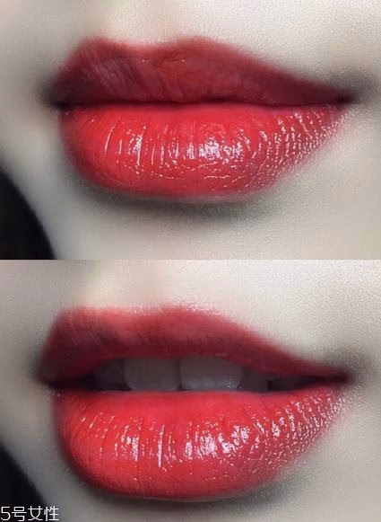 接下来就像填色游戏一样,用口红填满唇线内部的区域。一定要注意的是,唇刷沾取口红从嘴角向内涂抹,如果想得到自然晕染的效果,在用手指腹轻拍嘴唇。