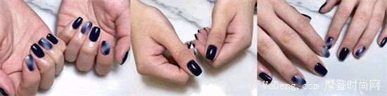 深蓝与黑色的融合,非常显手白,而且有种清冷气质,大理石纹路也暗含小心机,有种蓝莓牛奶的感觉。这款美甲也是一年四季都很适合的,喜欢的就快去尝试吧!